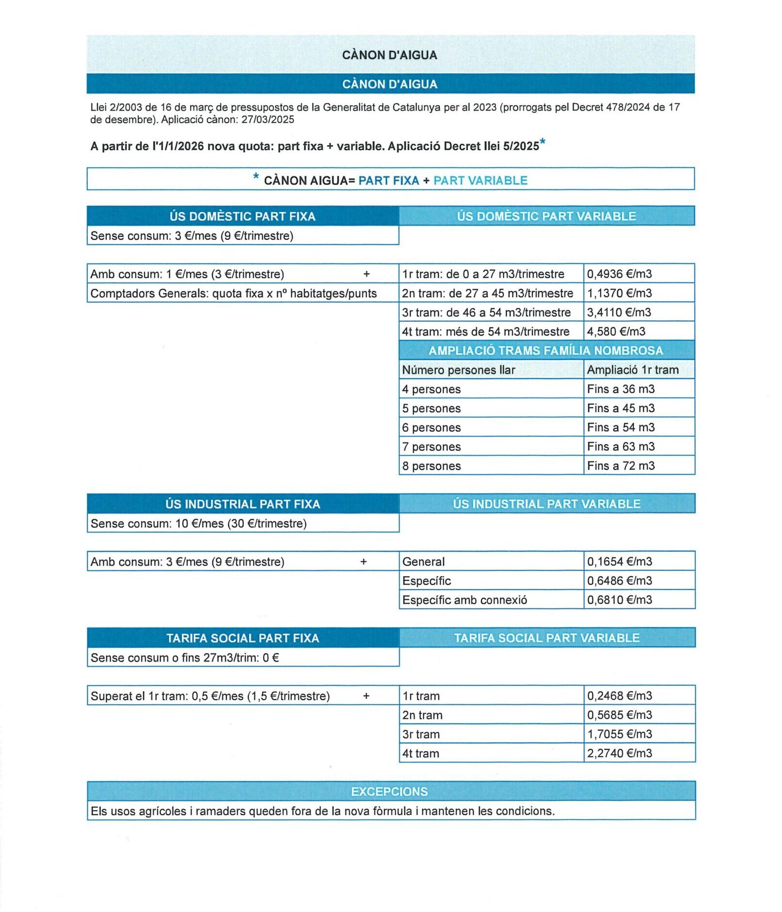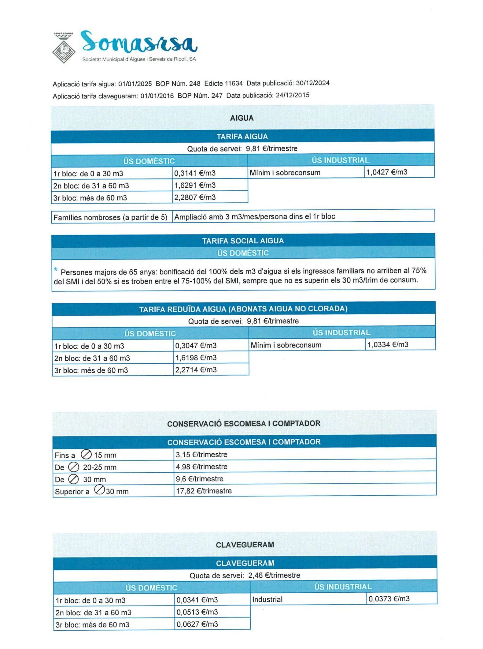 Aquestes són les tarifes vigents del Servei Municipal d’aigües de Ripoll. Pots descarregar-te les tarifes aquí